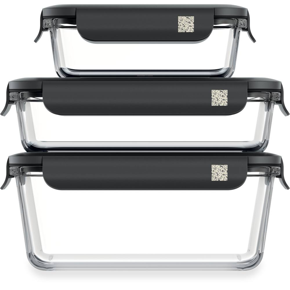 Drei rechteckige Frischhaltedosen aus Glas mit schwarzem Deckel und Verschluss. Auf jedem Deckel ein quadratischer QR-Code.