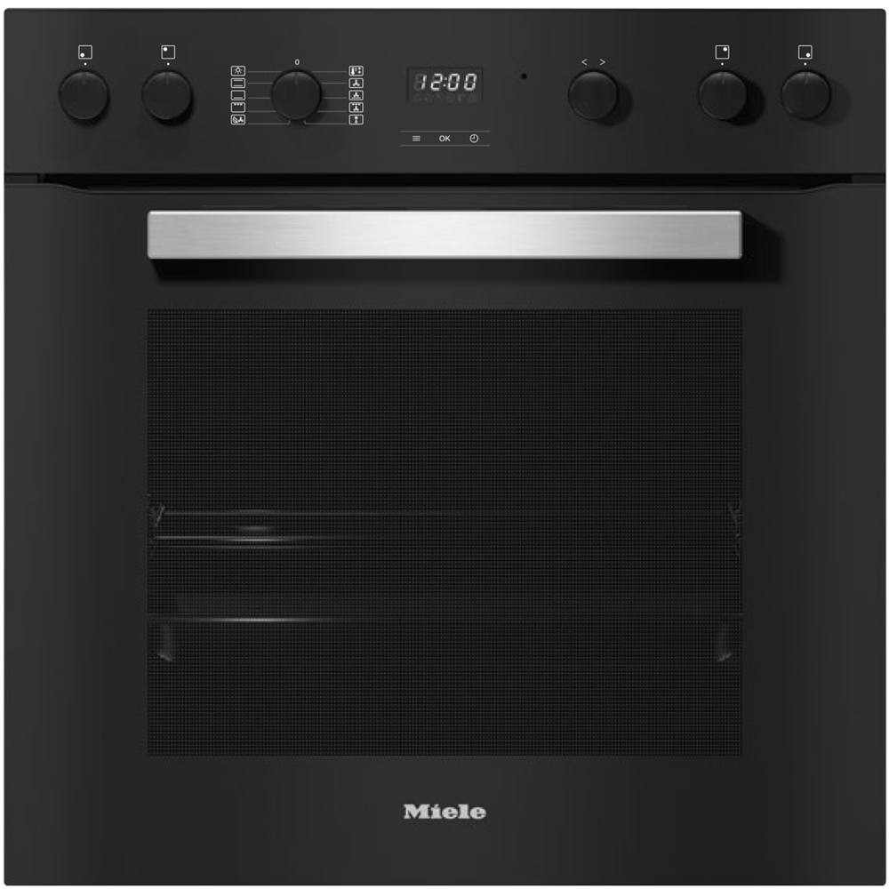 Schwarzer Backofen mit Digitalanzeige „12:00“ und Bedienknöpfen. Sichtbares Innenraumgitter. Herstellerlogo „Miele“ unten.