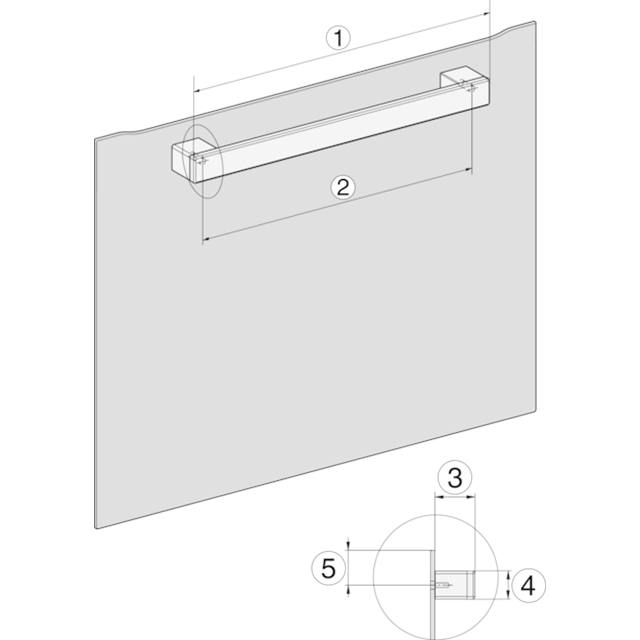 Technisches Schema einer rechteckigen Platte mit angebrachtem Profil. Detailansicht mit Maßangaben (1-5). Grauer Hintergrund.