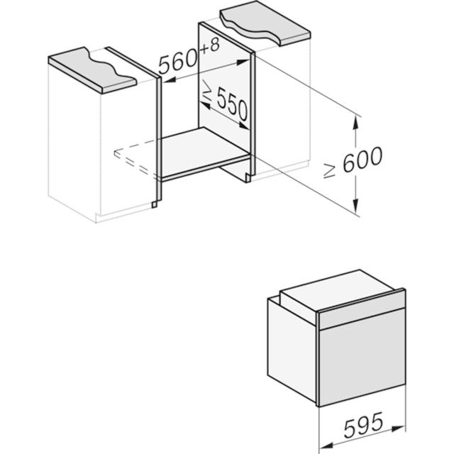 Skizze eines Einbaubacks mit Maßangaben: Breite 595, Tiefe 550, Höhe ab 600 mm. Perspektivische Darstellung.